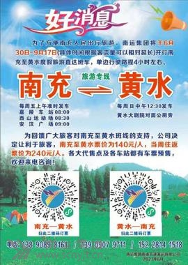 位于重慶石柱土家族自治縣境內(nèi)的黃水森林公園,屬國(guó)家級(jí)森林公園,年平均氣候在18度左右,是重慶市五個(gè)國(guó)家級(jí)森林公園中最年輕、面積最大、唯一的少數(shù)民族旅游風(fēng)景區(qū)。也是廣大旅游愛(ài)好者和夏季清涼避暑休閑的首選旅游景區(qū)。 為滿足廣大旅游愛(ài)好者和夏季清涼避暑休閑的出行需求,南充汽車客運(yùn)站從2023年6月30日起開(kāi)行南充至黃水的旅游直通車,發(fā)車時(shí)間為每周五上午08:00時(shí)。我們還可以為您提供團(tuán)體出行預(yù)約服務(wù),只為您能度過(guò)一個(gè)愉快而舒適的夏季!如果您想提前了解相關(guān)情況,歡迎廣大旅客通過(guò)電話咨詢:南充汽車客運(yùn)站服務(wù)熱線:0817-3638622 15228141518 溫馨提示: 1.網(wǎng)絡(luò)購(gòu)票請(qǐng)下載“團(tuán)子出行”或“四川汽車客運(yùn)票務(wù)網(wǎng)”。 2.乘車時(shí)請(qǐng)攜帶本人有效身份證件乘車。 (南充客運(yùn)站 彭慶紅) (高客分公司 朱 玲)