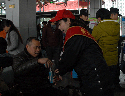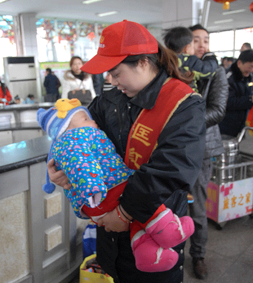 頭戴“小紅帽”的“匡紅艷愛心班”的站務(wù)人員,身佩大紅授帶,不斷地穿行在售票廳、候車廳。有為購票旅客解答疑難的導乘人員,有在咨詢處為旅客不厭其煩耐心解答的咨詢?nèi)藛T,有在車站候車廳為旅客送鮮開水的服務(wù)人員,還有嘉陵區(qū)團委安排的4名青年志愿者,他們滿腔熱情地扶老攜幼,在行包安檢后幫提行李,讓旅客順利的登上返程班車。一位獨自一人去墊江的女乘客放心的將自己不到一歲的小寶寶遞交給“小紅帽”站務(wù)人員抱著,以便自己入廁,當又抱回自己的小寶寶后,非常感謝“小紅帽”的幫助。