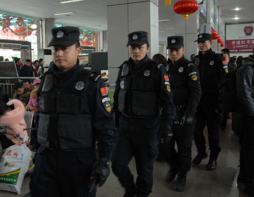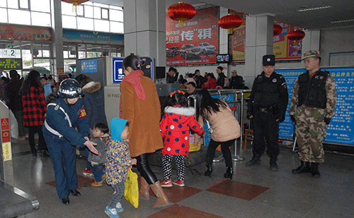 中午1點多鐘,由于成南高速公路私家小車流量增大,嚴重堵車,造成加班車輛不能及時返回車站,致使到成都的旅客排著兩列隊伍從候車廳8號檢票口一直延伸到5號檢票口對面的候車廳內(nèi)。但一直沒有看見到成都排隊上車的隊伍延伸到候車廳外,象往年那樣在站前廣場蜿蜒曲折“山路十八彎”的情景了。懸掛著12個大紅燈籠的整個候車大廳里旅客十分擁擠,人滿為患,卻暖意融融。車站派出所所長楊宗明帶領(lǐng)6名公安干警和嘉陵區(qū)公安分局的8名特警來回巡邏執(zhí)勤,反恐防暴,高度警惕地維護著檢票上車和旅客候車秩序。